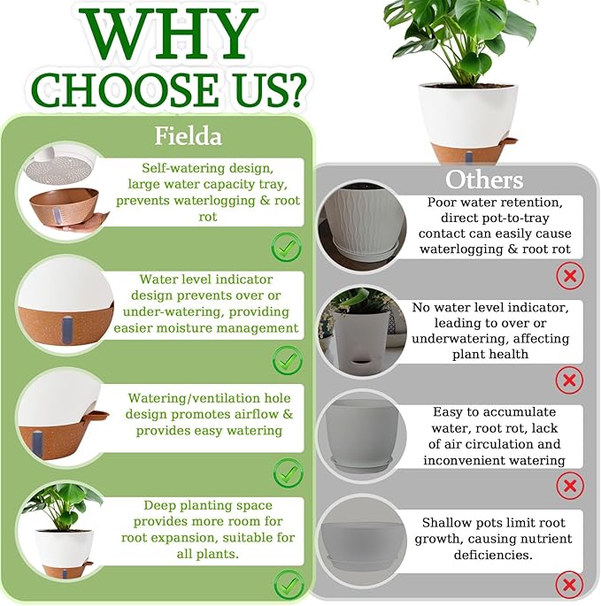 - 🌿 【Self-Watering Feature】The Fielda 10 Inch Plastic Planter comes with a built-in self-watering system that uses absorbent cotton wicks to draw water from the bottom tray into the planter. This ensures your plants stay hydrated with less effort, saving you from frequent watering. Whether you're a busy gardening enthusiast or away for long periods, you can easily maintain your plants' moisture balance, ensuring they get the right amount of water and nutrients.