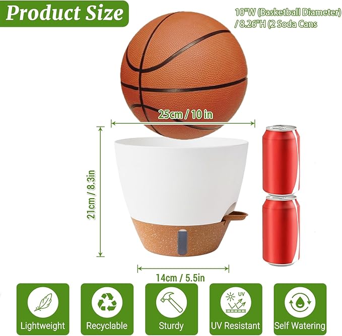 - 🔍 【Precise Dimensions & Plant Fit Guide】 🌿Top Opening**: 10 inch (25.4 cm) - Width at rim, compare to basketball diameter (9.5") 🌿Total Height**: 8.3 inch (21 cm) - **Includes 1.8" water reservoir** 🌿Base Width**: 5.9 inch (15 cm) - Wider than soda can height (4.8") for stability -🌿Ideal For**: Plants 12"-18" tall like Pothos, ZZ Plant, young Monsteras 🌿Not For**: Large Fiddle Leaf Figs (>20") or vegetable plants *Pro Tip: Measure your plant's current pot top diameter before buying!